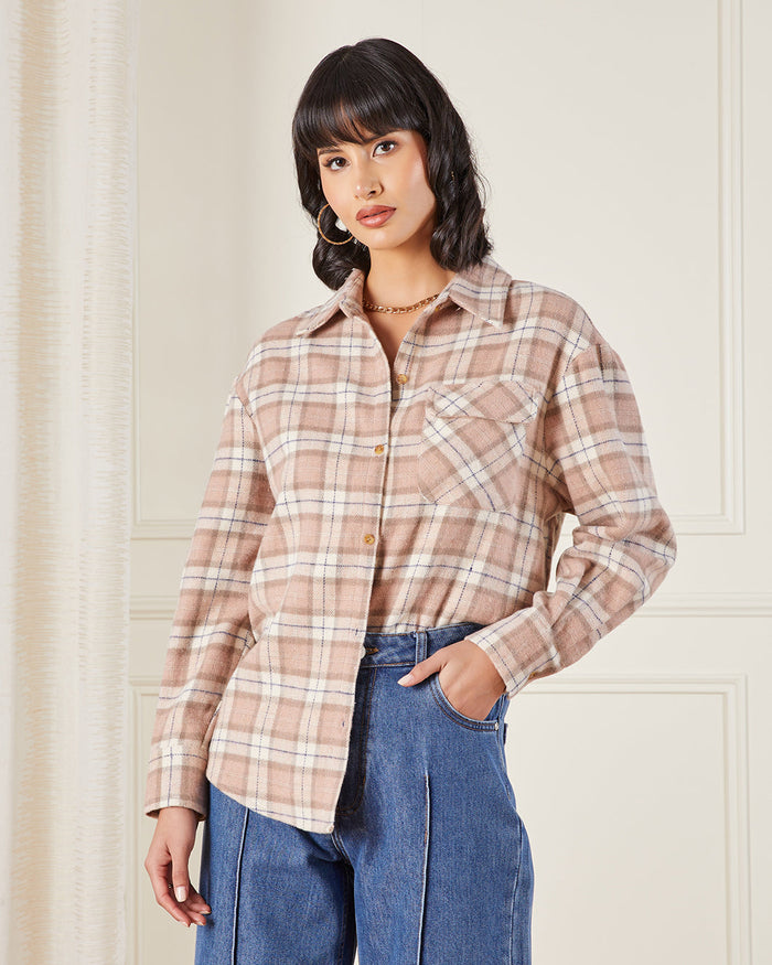 قميص كاروهات بأزرار أمامية باللون البيج للنساء