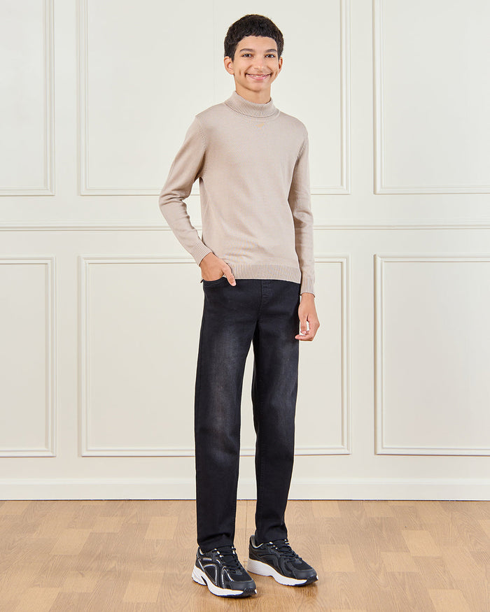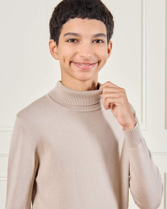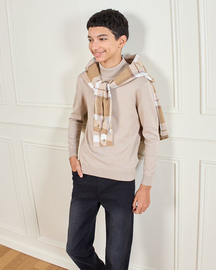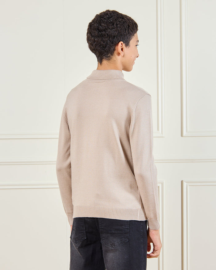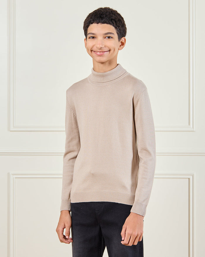 أضف لمسة من الدفء والأناقة لإطلالته مع هذا السويتر بالياقة العالية باللون البيج. يتميز بخامة محبوكة ناعمة وتفاصيل مضلعة عند الأطراف ليمنحه راحة وأناقة مثالية للأيام الباردة، سواء تم تنسيقه تحت الجاكيت أو بمفرده لإطلالة أنيقة وعصرية.