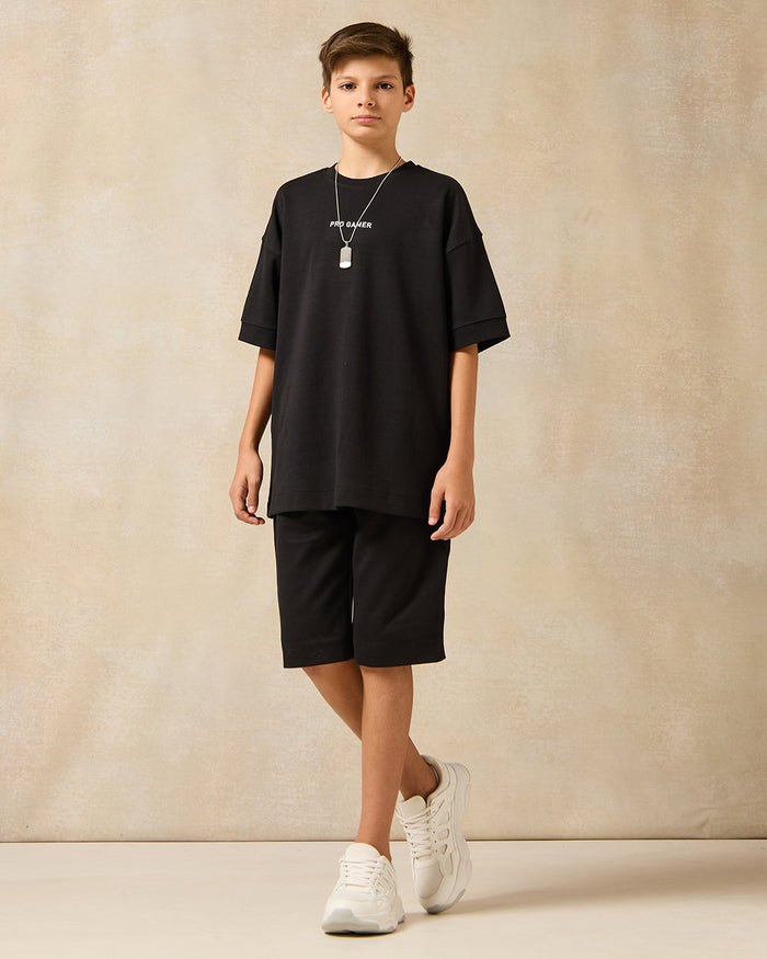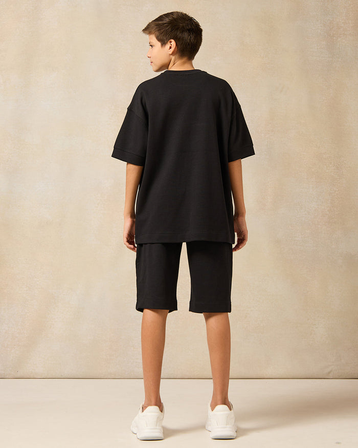 يعد هذا الطقم مناسب للأولاد النشطين حيث يشمل الطقم تيشيرت وشورت مريح. مناسب للأنشطة العملية والرياضية حيث يمكن تنسيقه مع حذاء رياضي لإطلالة كاملة.