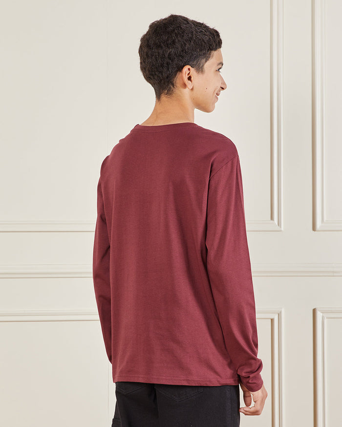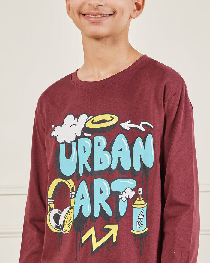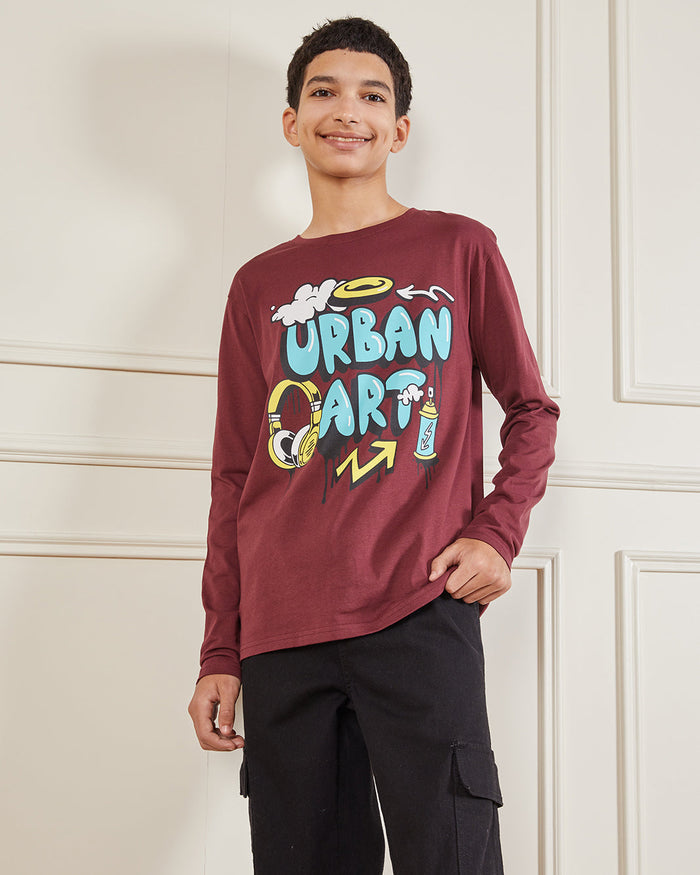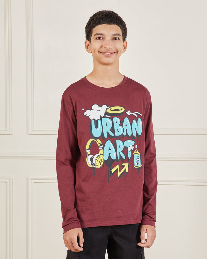 تيشيرت بطبعة باللون الأحمر الداكن للأولاد الكبار