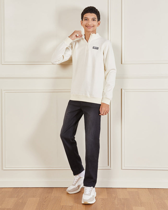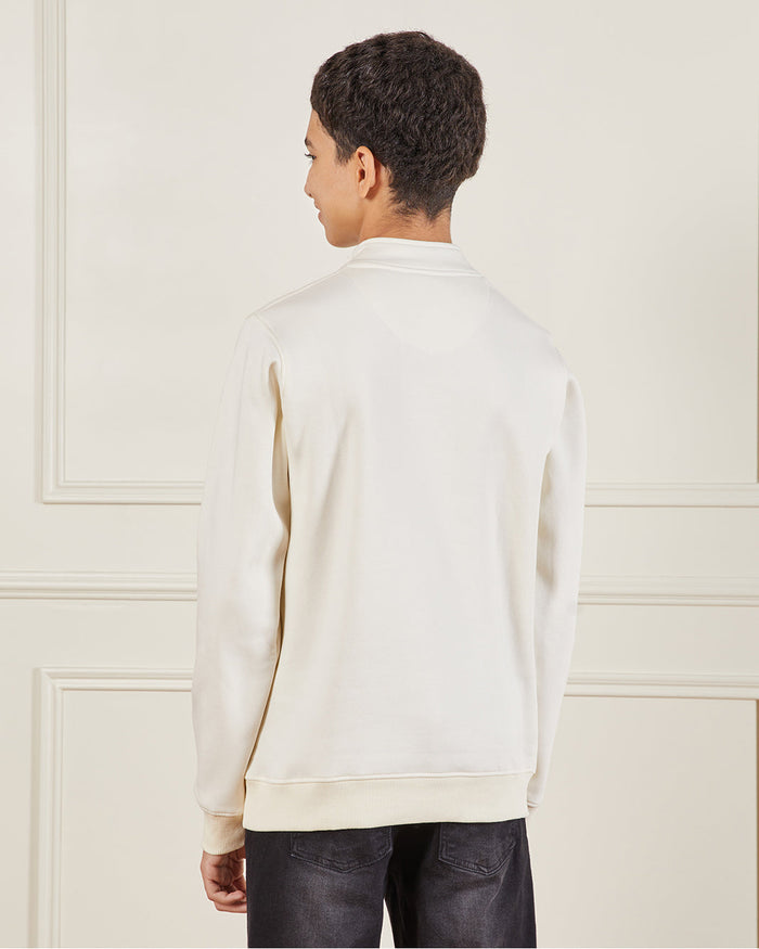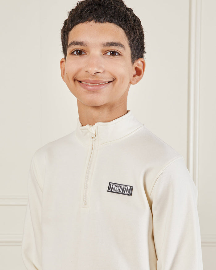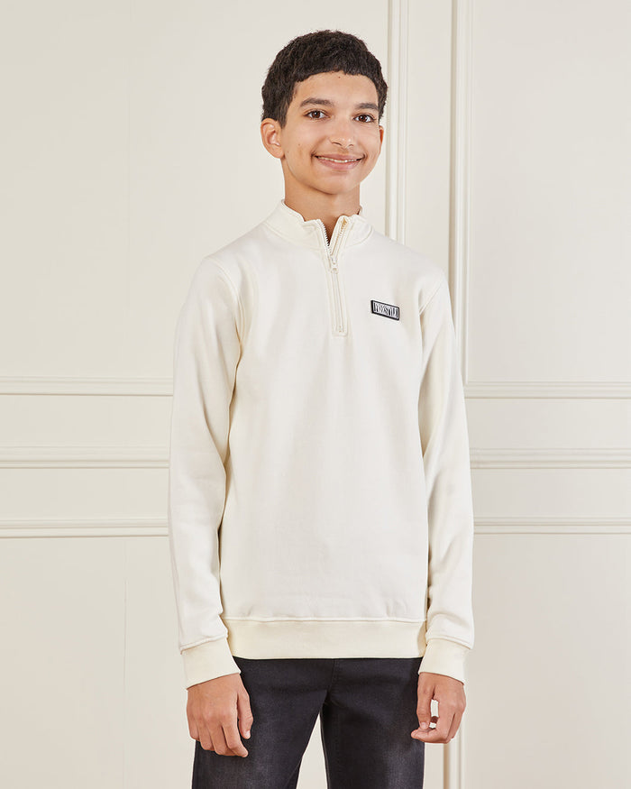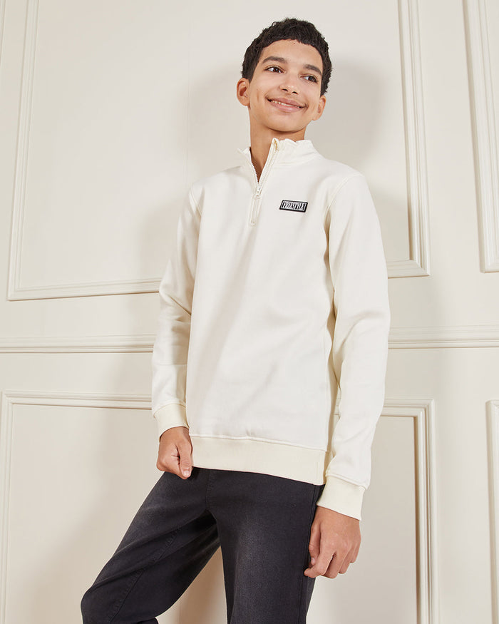 إطلالة عصرية ومريحة مع سويتر أولاد بسحّاب نصفي باللون الكريمي. يتميز بياقة عالية وتفصيلة شعار على الصدر لمظهر أنيق وبسيط. مصنوع من مزيج قطني ناعم يمنح الدفء والراحة طوال اليوم.