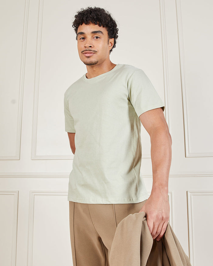 تيشيرت كلاسيكي باللون الأخضر الفاتح، مصنوع من قماش ناعم يمنحك راحة مثالية للاستخدام اليومي. يتميز برقبة دائرية وأكمام قصيرة، مناسب للارتداء بمفرده أو مع طبقات لإطلالة كاجوال.