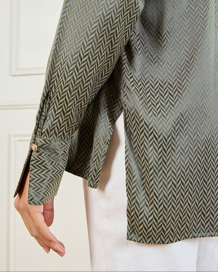 ارتقي بإطلالتك الأنيقة اليومية مع هذا القميص المطبّع باللون الزيتوني. مصنوع من قماش ناعم مع أزرار وياقة كلاسيكية، يمكن تنسيقه بسهولة مع بنطال أو جينز لمظهر عصري أنيق.