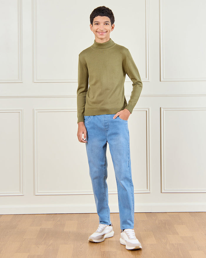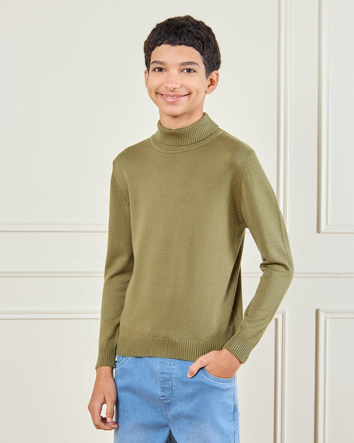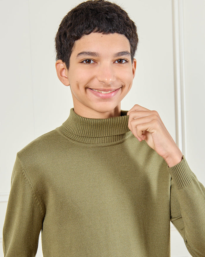 سترة محبوكة برقبة عالية باللون الزيتي للأولاد الكبار