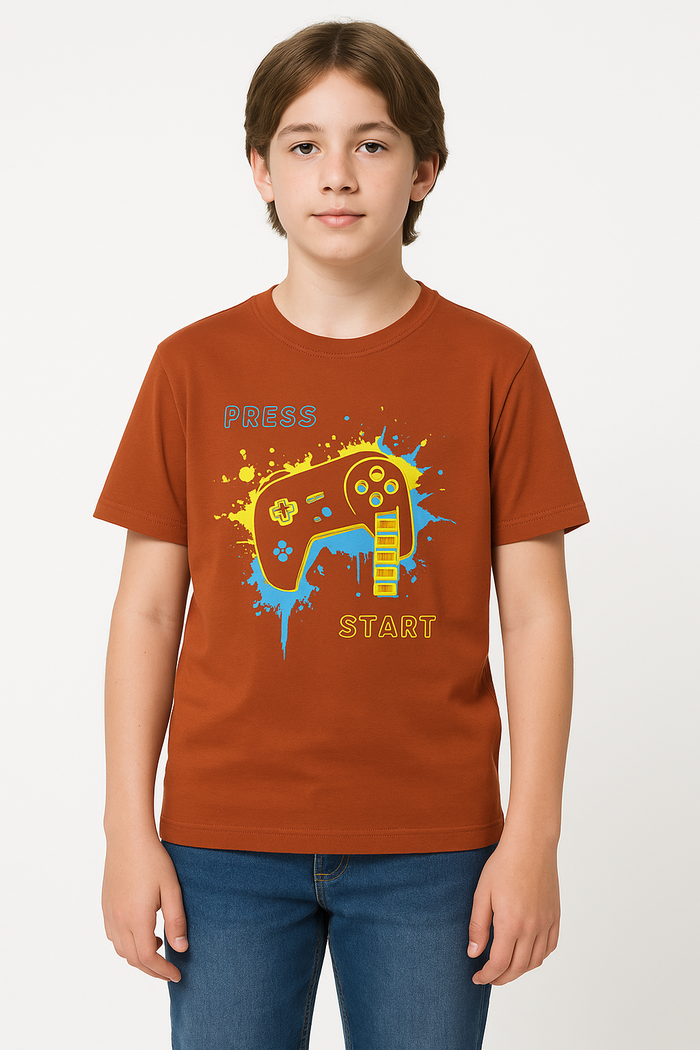تيشيرت قطن ناعم للأولاد من عمر 8 إلى 16 سنة، مزين بطبعة ألعاب مميّزة. تصميم بفتحة رقبة مستديرة وأكمام قصيرة للارتداء اليومي المريح.