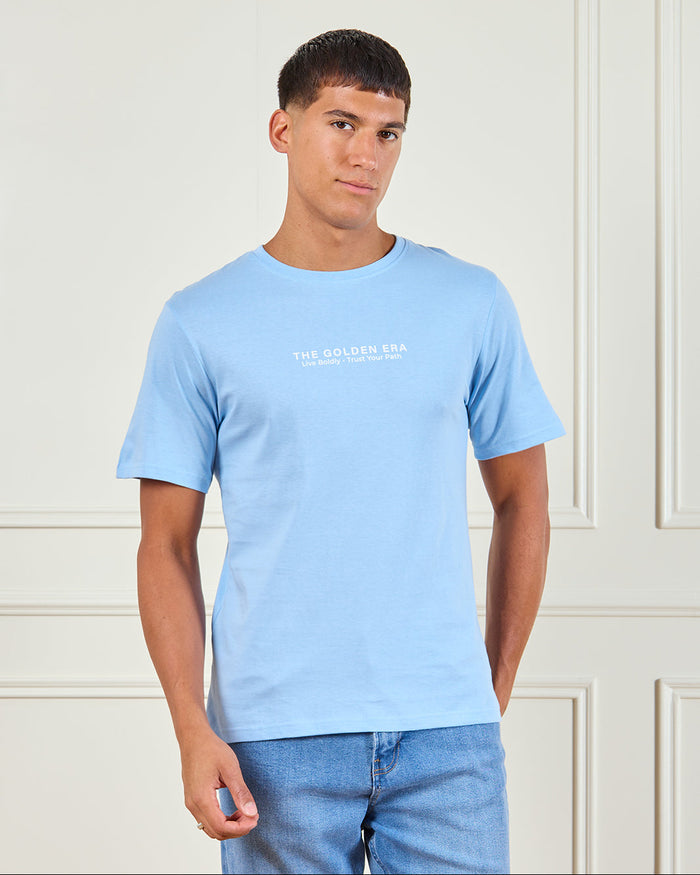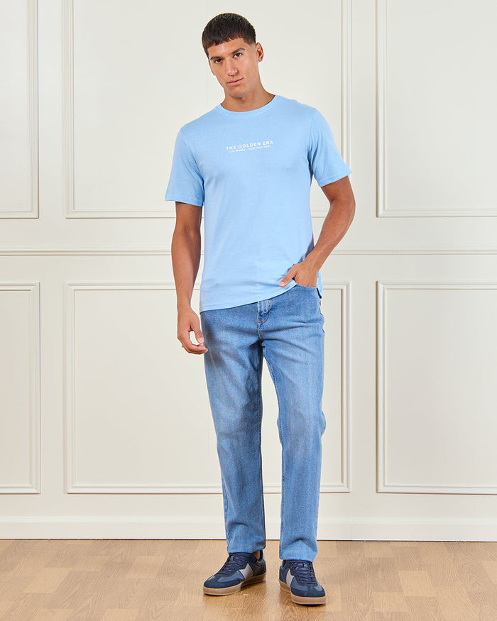 جددي إطلالاتك اليومية مع هذا التيشيرت باللون الأزرق الفاتح والمزين بطبعة أمامية بسيطة. تصميم يجمع بين الأناقة العصرية والبساطة، مصنوع من قطن ناعم يسمح بمرور الهواء لراحة تدوم طوال اليوم، مثالي لتنسيقه مع الجينز أو الشورت لإطلالة مريحة.
