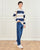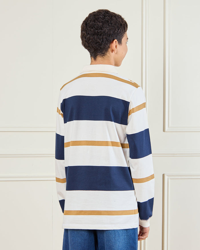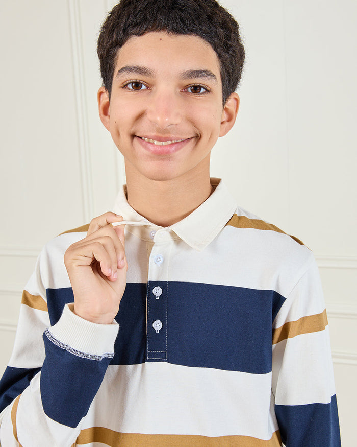 أضف لمسة رياضية لخزانته مع هذا التيشيرت البولو المخطط بأكمام طويلة. يتميز بخطوط بارزة باللون الكحلي والجملي وياقة بأزرار، مما يجعله خياراً مثالياً للمشاوير اليومية أو للأيام الباردة.