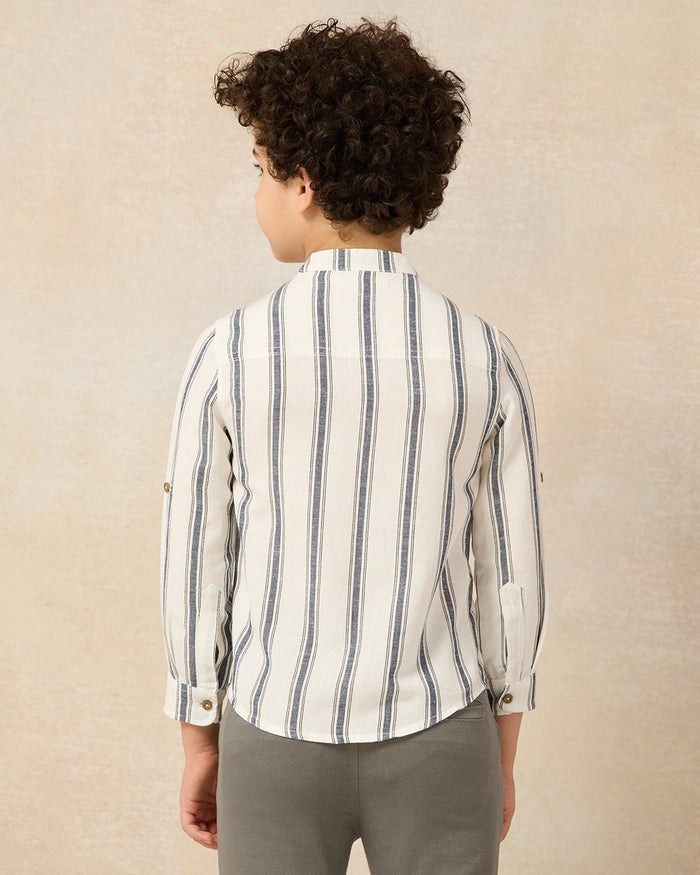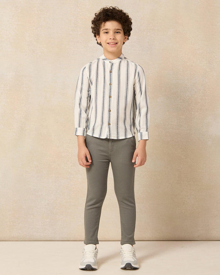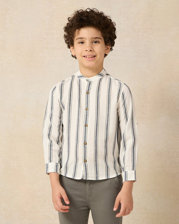 قميص بأكمام طويلة وياقة ماندارين للأولاد، بتصميم أنيق يجمع بين العصرية والرقي. مثالي للمناسبات الخاصة أو الإطلالات اليومية الأنيقة.