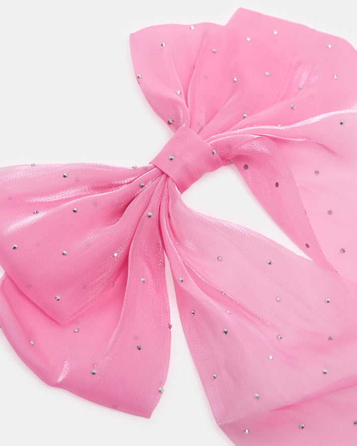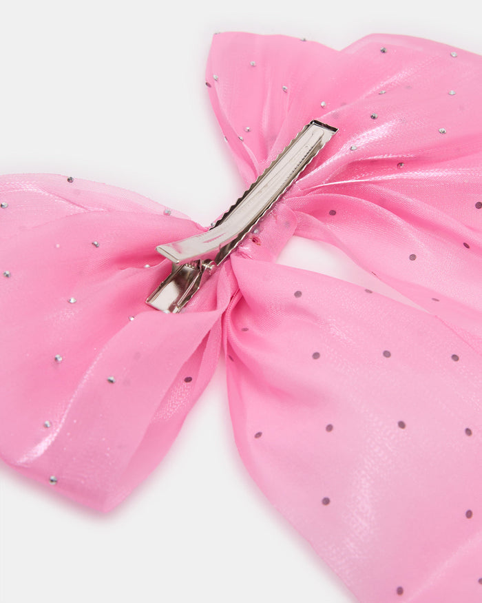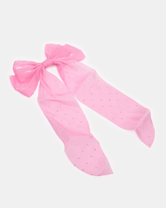 This sheer pink bow hairpiece adds a sweet and elegant touch to her hairstyle, perfect for parties or dressing up.