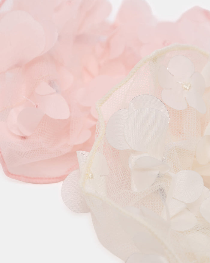 A set of two floral scrunchies crafted with delicate petals, perfect for everyday use or special occasions.