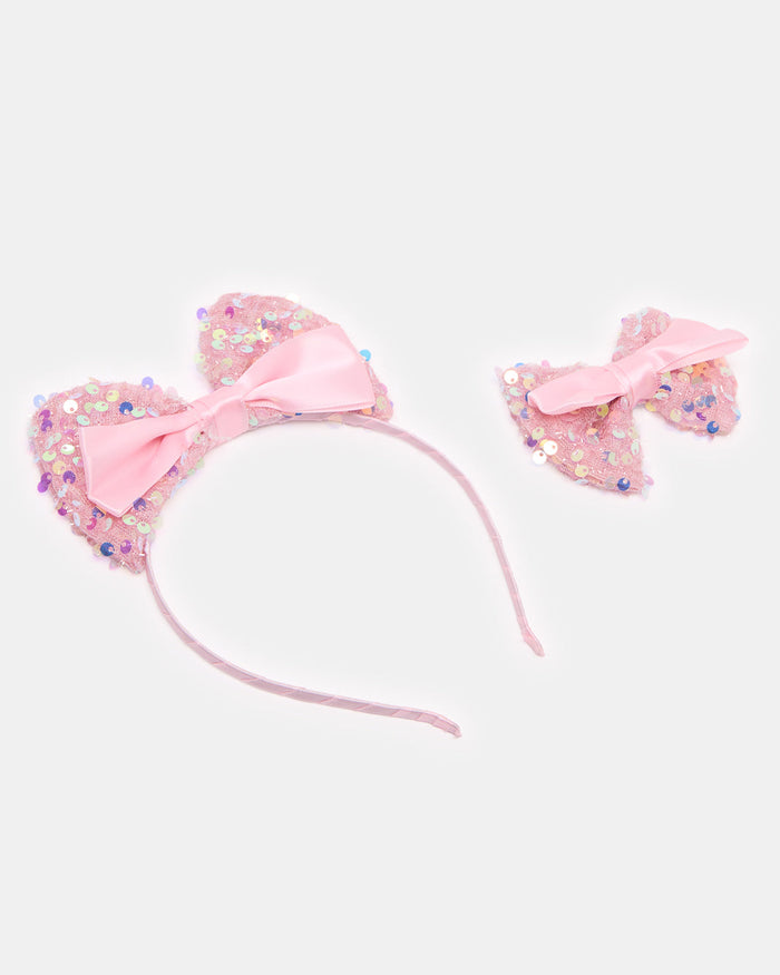 This matching set features a sparkling sequined bow headband and a clip for coordinated style. The soft band ensures comfort, while the glitter adds fun to her outfit.