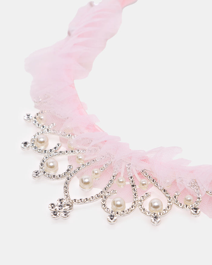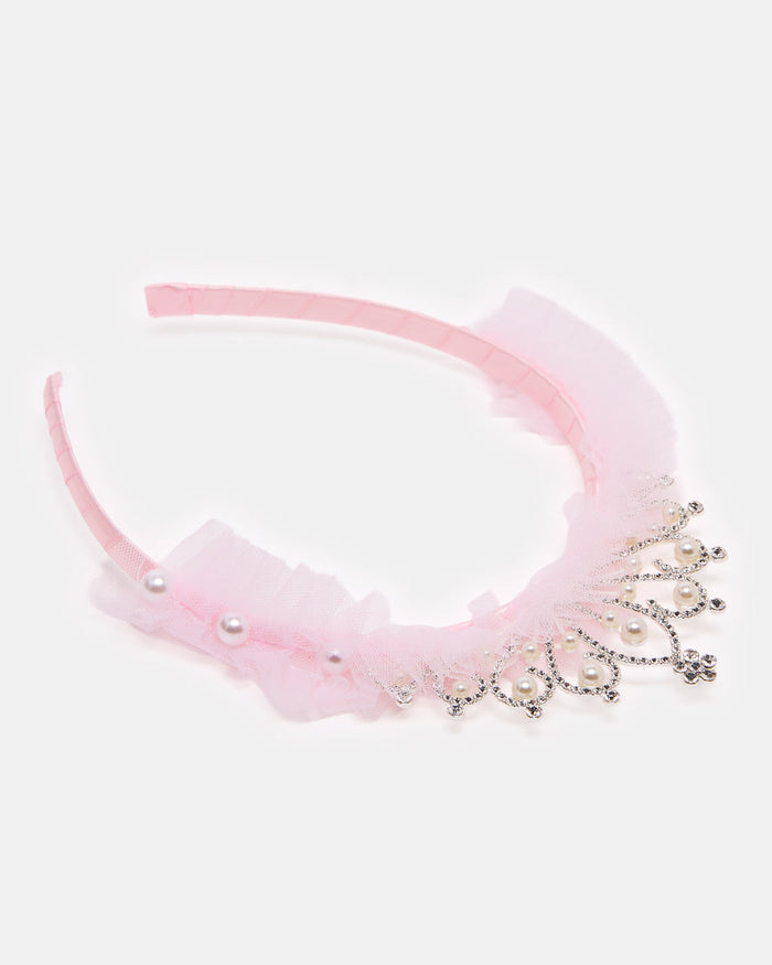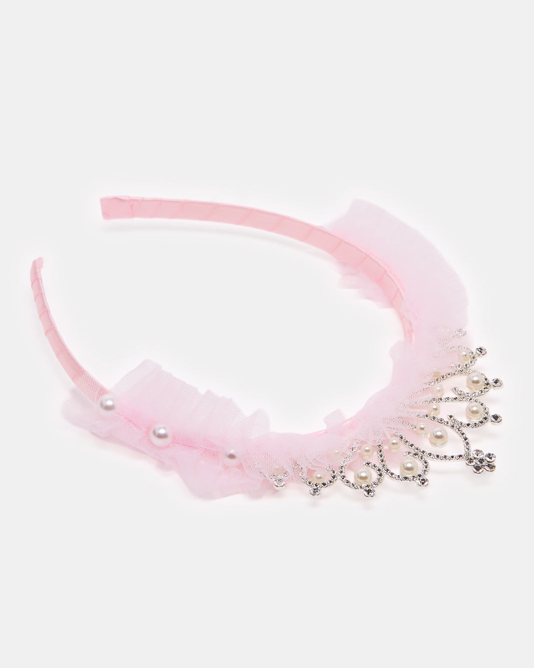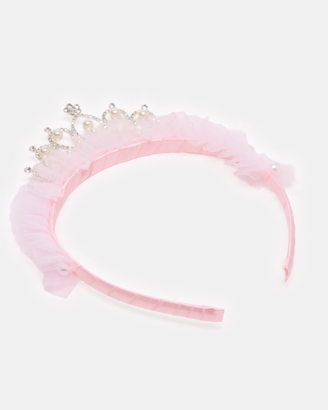 Let her feel like royalty with this tiara-style headband adorned with pearls and tulle. Lightweight and elegant, perfect for special occasions and dress-up play.