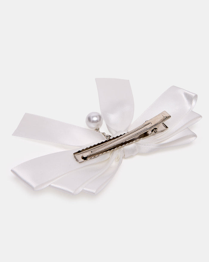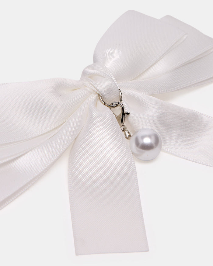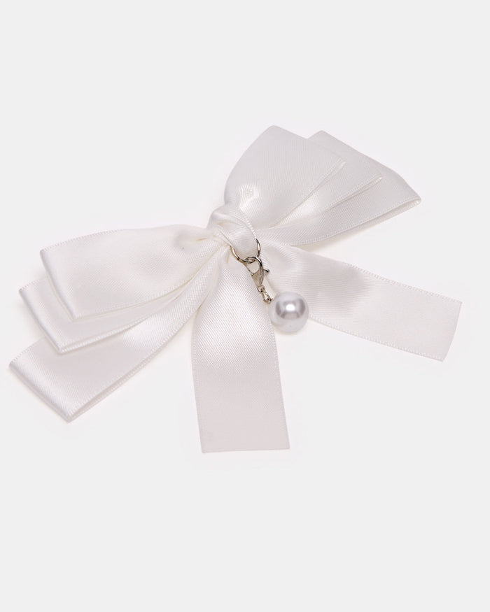 Elegant and timeless, this white ribbon hair clip with a dangling pearl accent adds a graceful finish to any outfit.