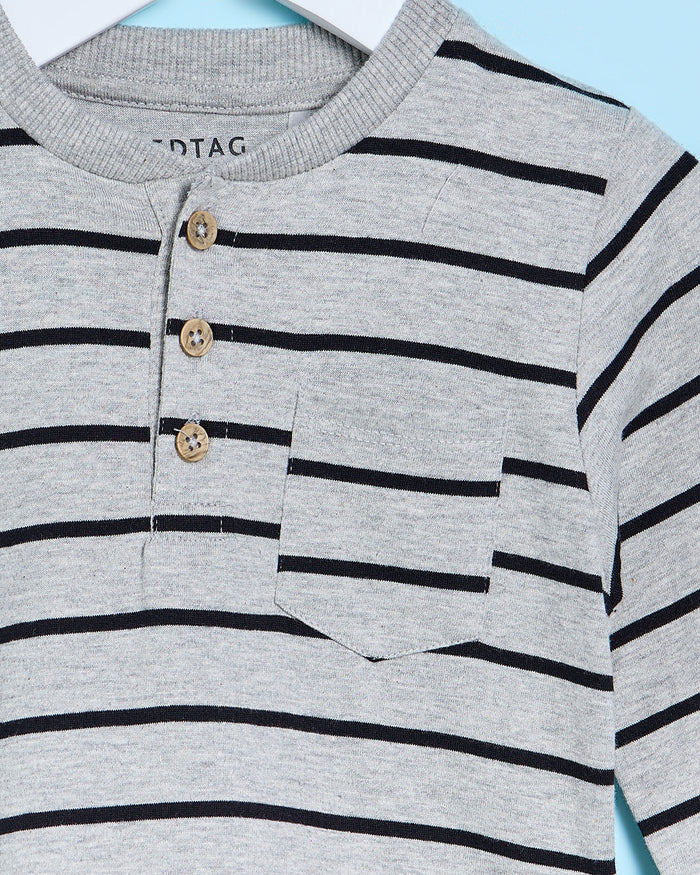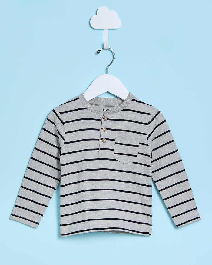 offers a perfect blend of comfort and style. Featuring a soft, textured jacquard fabric and a classic Henley button-up design, it’s both trendy and versatile. Ideal for any occasion, this T-shirt ensures your little one stays cool and stylish all day.