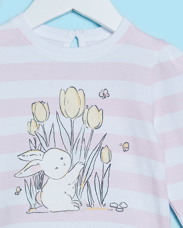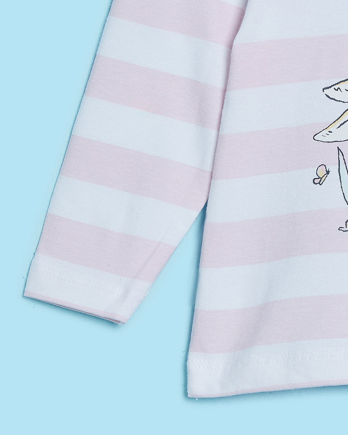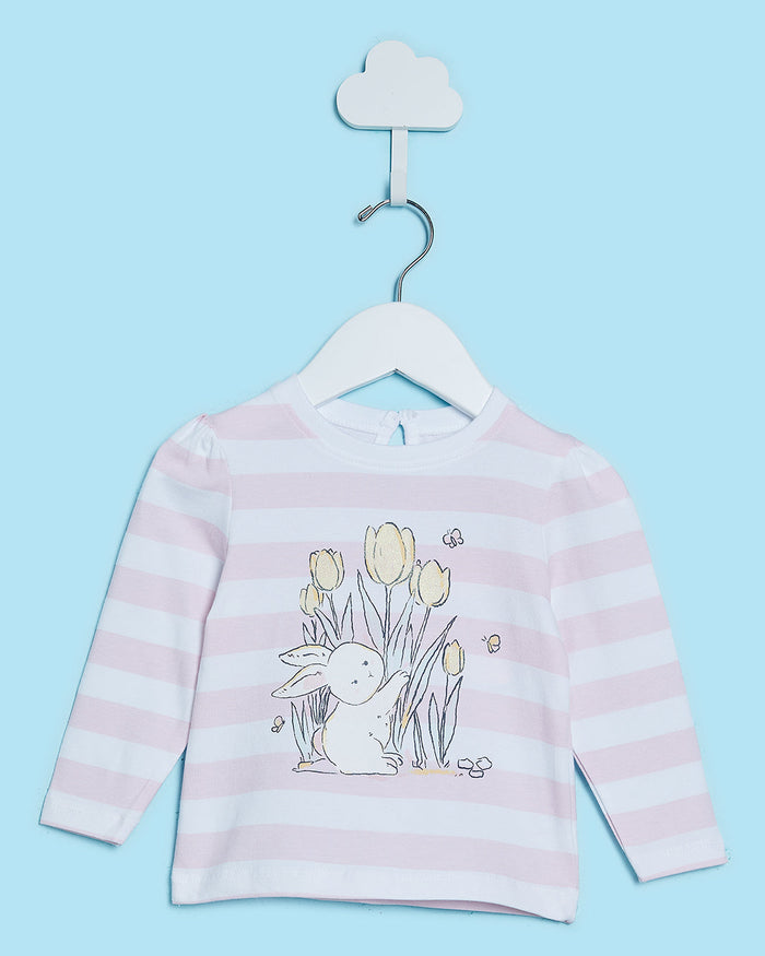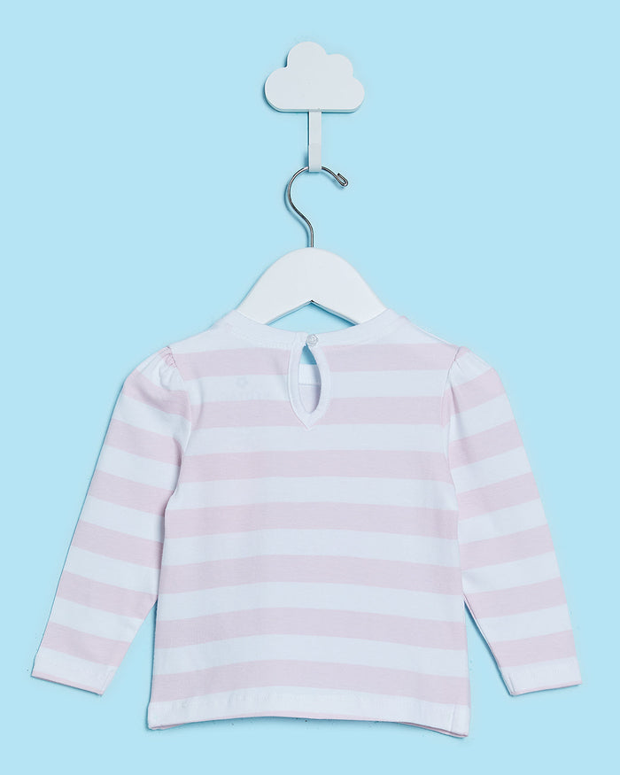 Infant Girls Pink And White Striper With Placement Print Long Sleeves T-Shirt