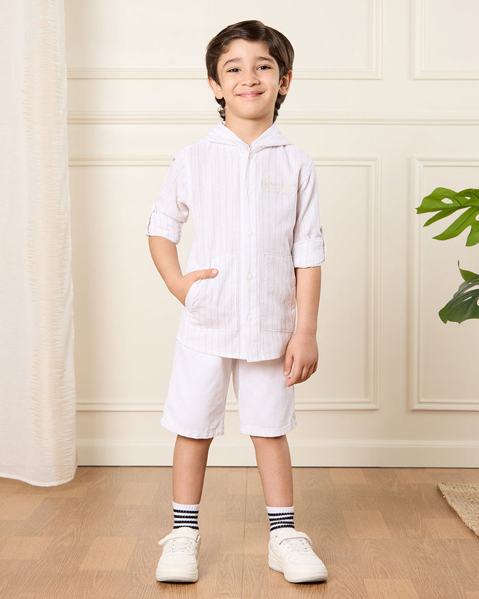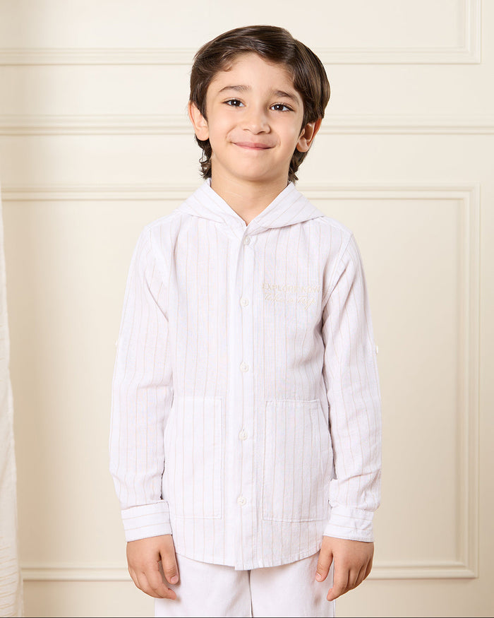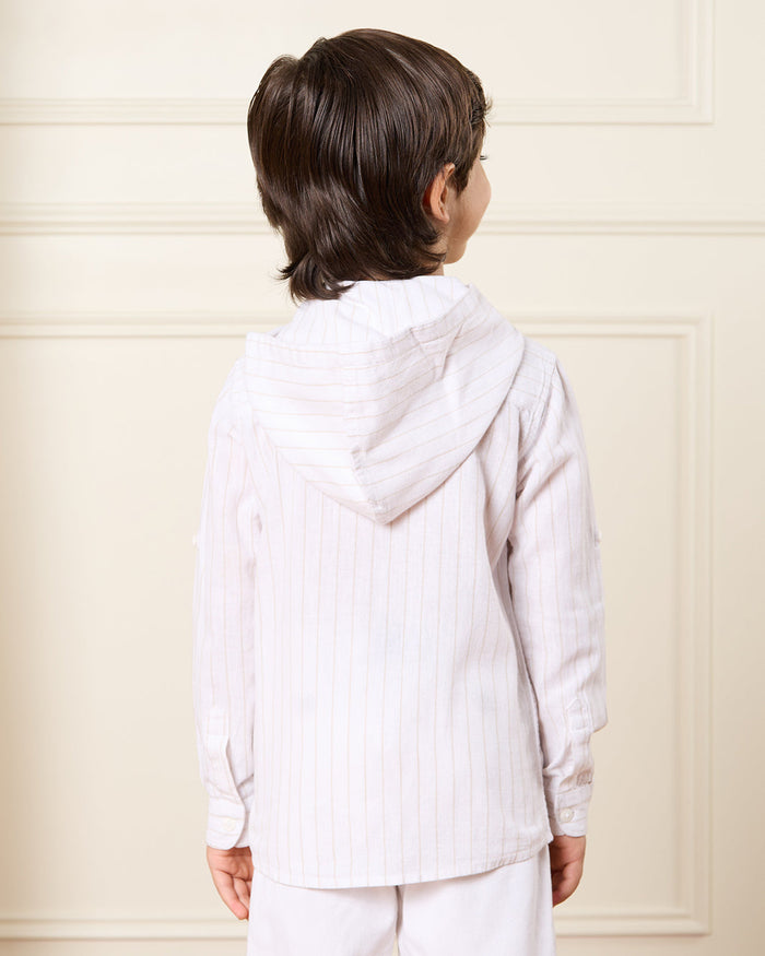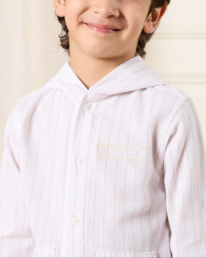 A lightweight linen hooded shirt for boys, combining casual style with breathable comfort. Great for layering on breezy days or wearing on its own for a laid-back look.