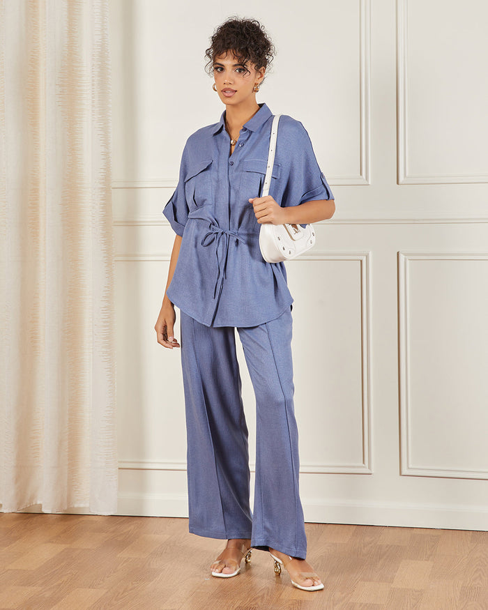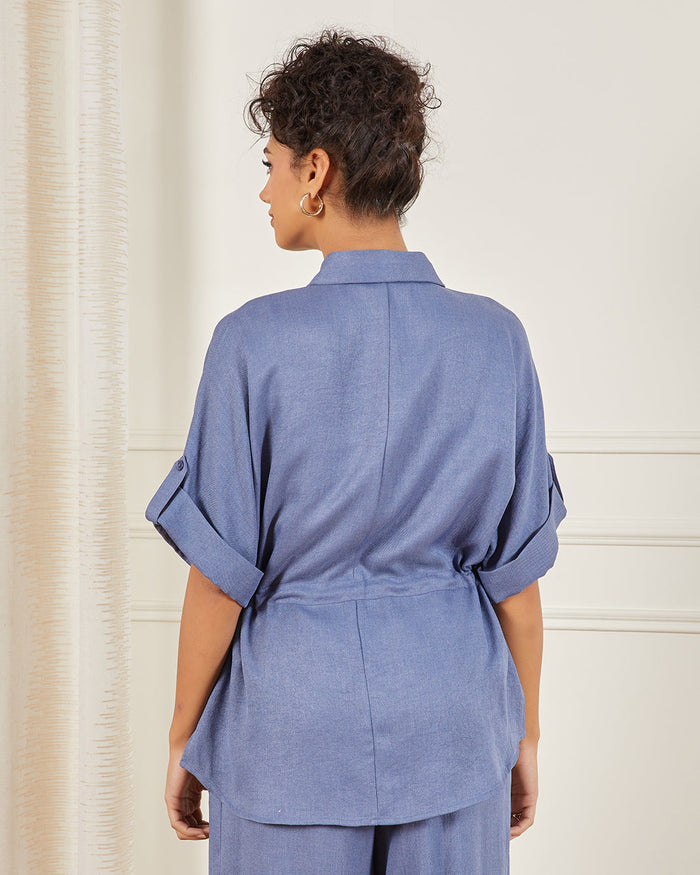 Women Blue Button Down Pull On Waist Detailed Blouse