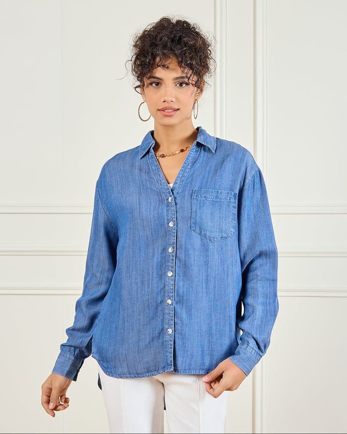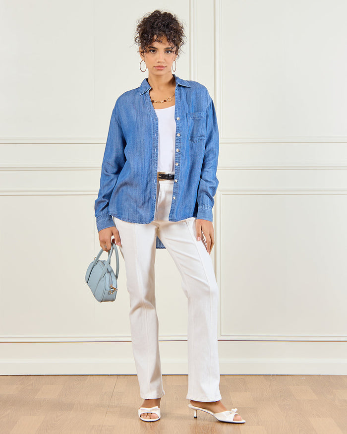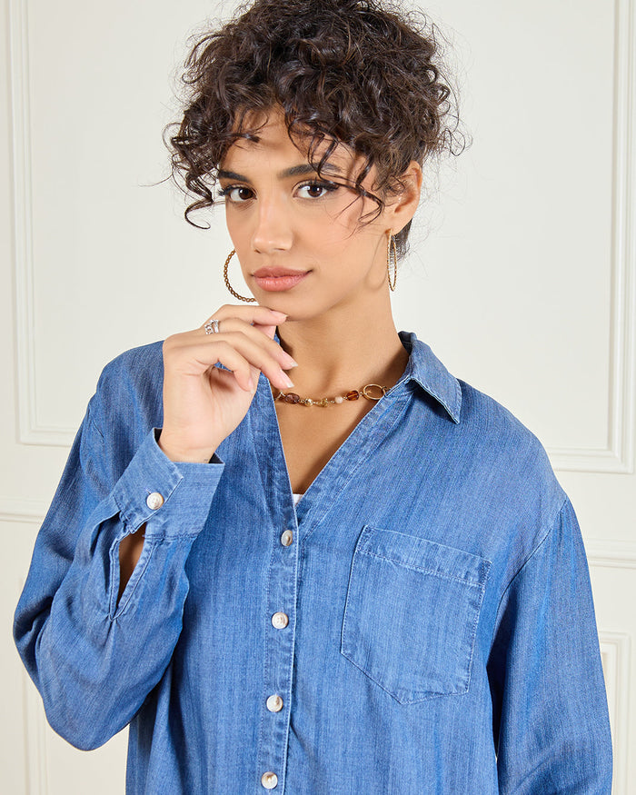 Add a timeless touch to your casual looks with this blue denim shirt. Designed with a button-down front and chest pocket, it’s perfect for layering or wearing solo for a laid-back vibe.