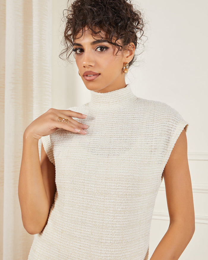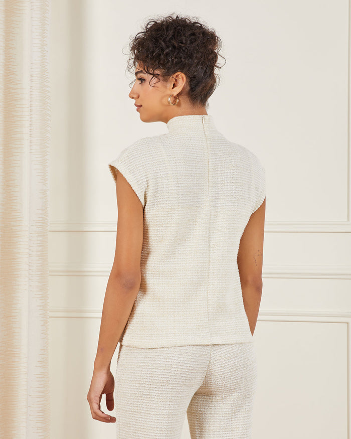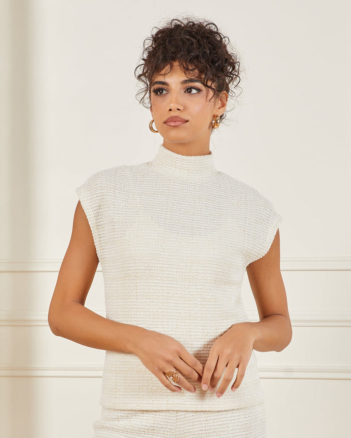 Keep it elegant with this sleeveless high-neck top featuring a soft textured finish. Perfect for layering or wearing alone for a minimalist look.
